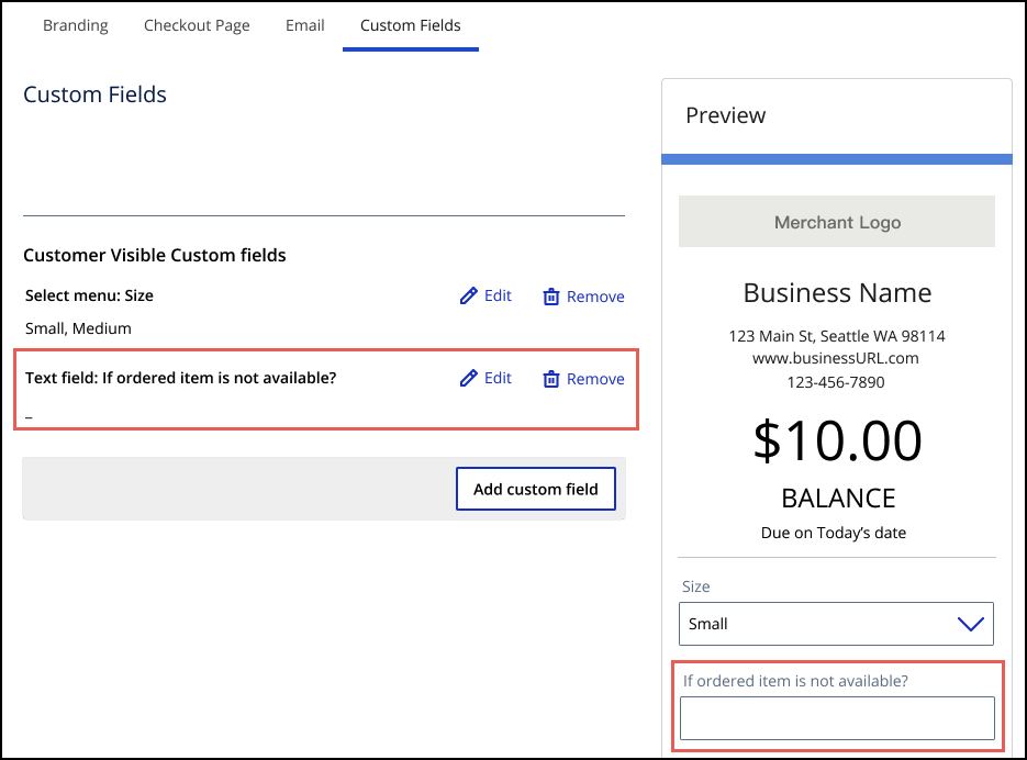 - Check theCustomer visiblebox to make the text field viewable by the customer.You can check theCustomer Read Onlybox to prevent the customer from entering text in the text field. Choose this option if you want to display a message to the customer.