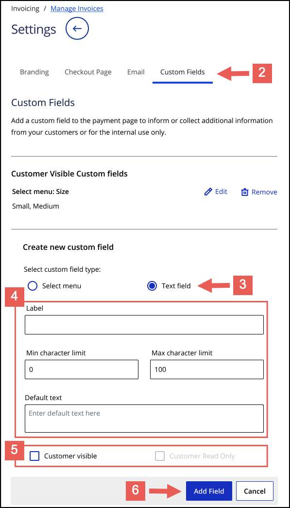 - Enter this information in the fields:Text Field InformationField NameDescriptionLabelThe title of the new custom text field.Min character limitThe minimum number of characters the customer or merchant must enter in the text field.Max character limitThe maximum number of characters the customer or merchant must enter in the text field.Default textThe text that displays by default in the text field.